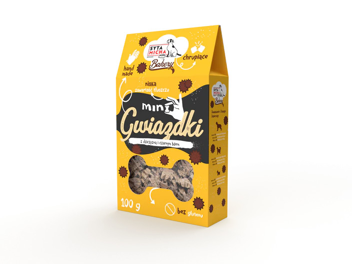 Mini csillagok kézzel készített, sült kutyakekszek. Hihetetlenül ropogós, apró méretű falatok, amelyek összetétele finom vadhúsra épül, amely gazdag fehérjében és vasban, valamint fekete bodza gyümölcsére, amely C- és A-vitamin forrása, vírusellenes és immunmoduláló tulajdonságokkal rendelkezik. Egyéb egészségvédő összetevők között tartalmaz cellulózt, köményt, kakukkfüvet és élesztőt.