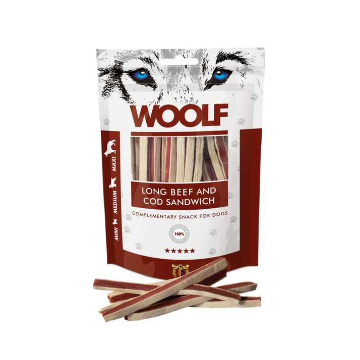A Woolf Long Beef and Cod Sandwich marhahúsos és tőkehalas szendvics 100%-ban kiváló minőségű húsból készült, hogy a legmagasabb minőséget és tápanyagbevitelt biztosítsa.